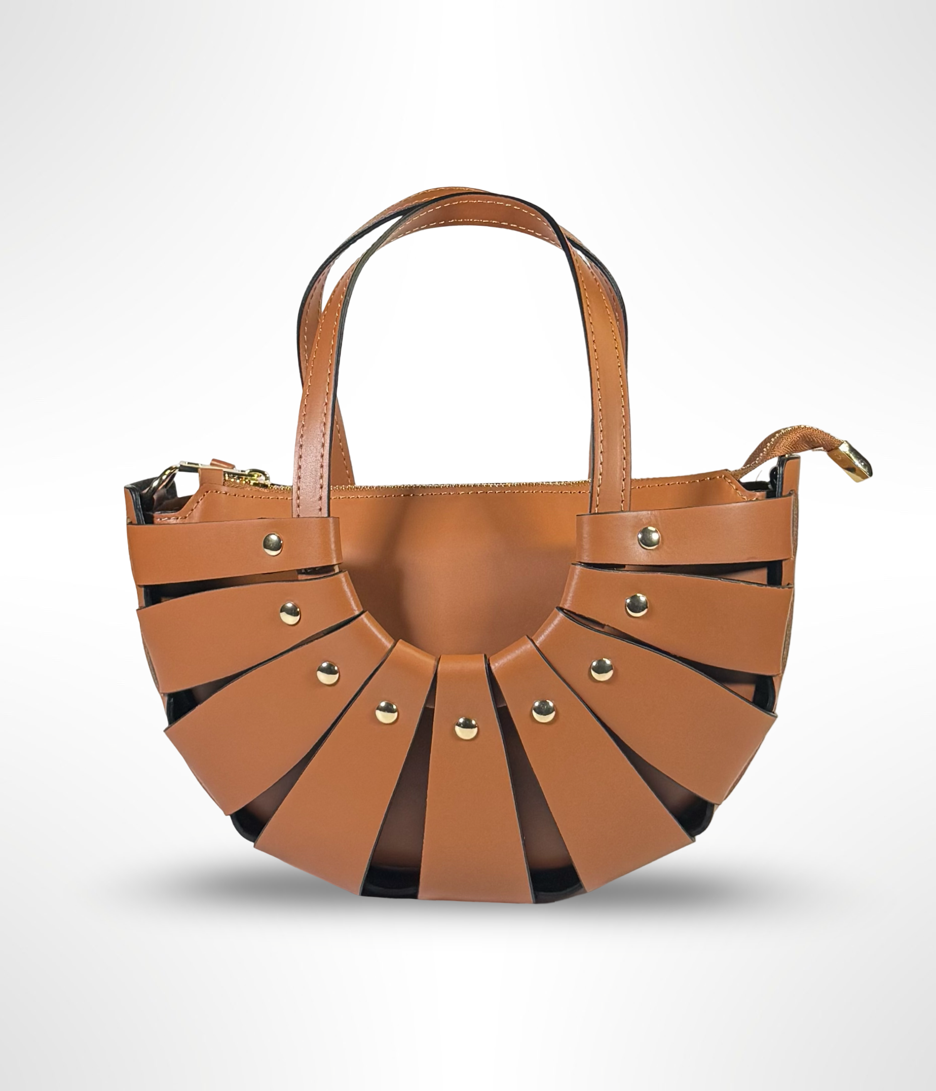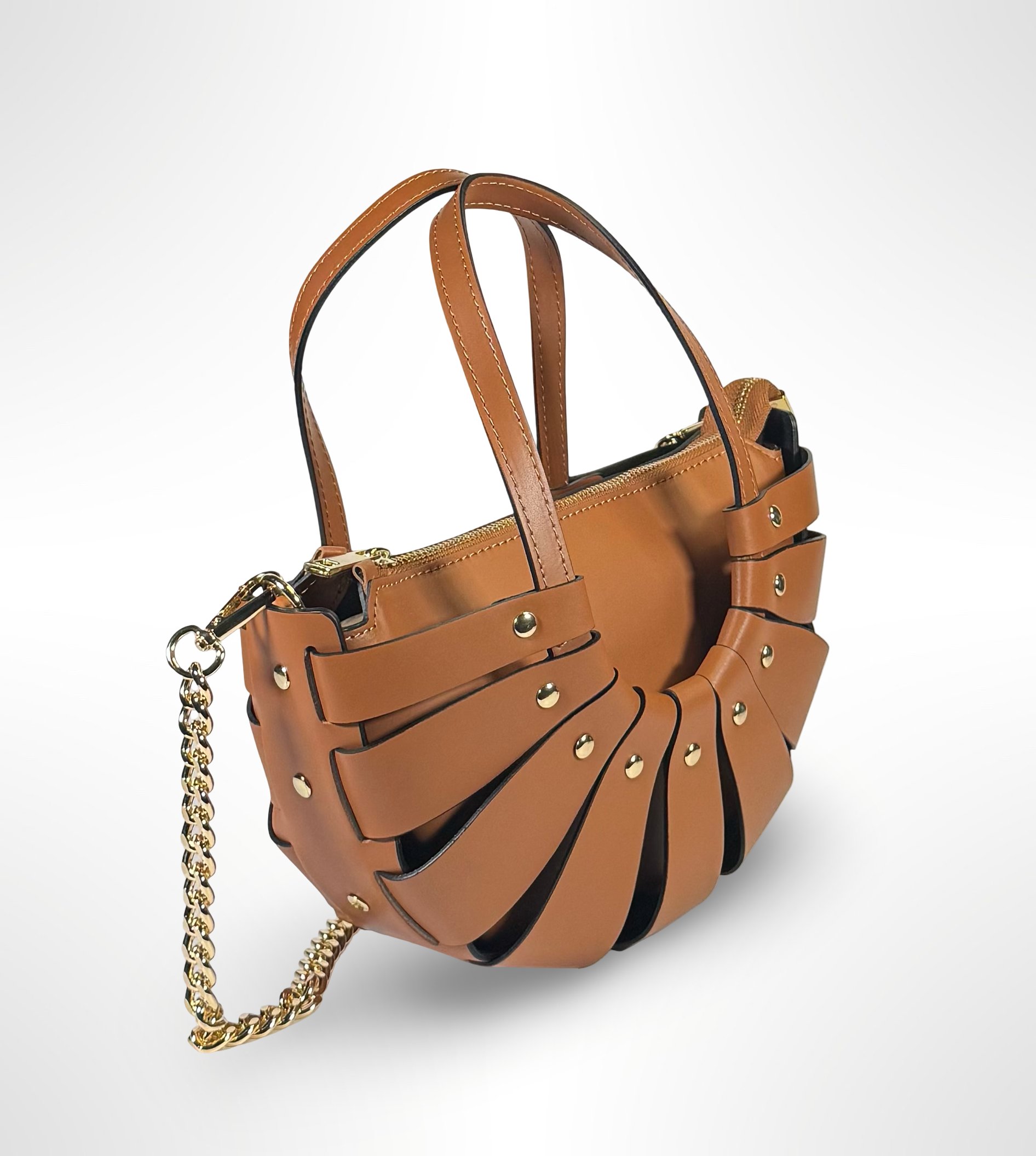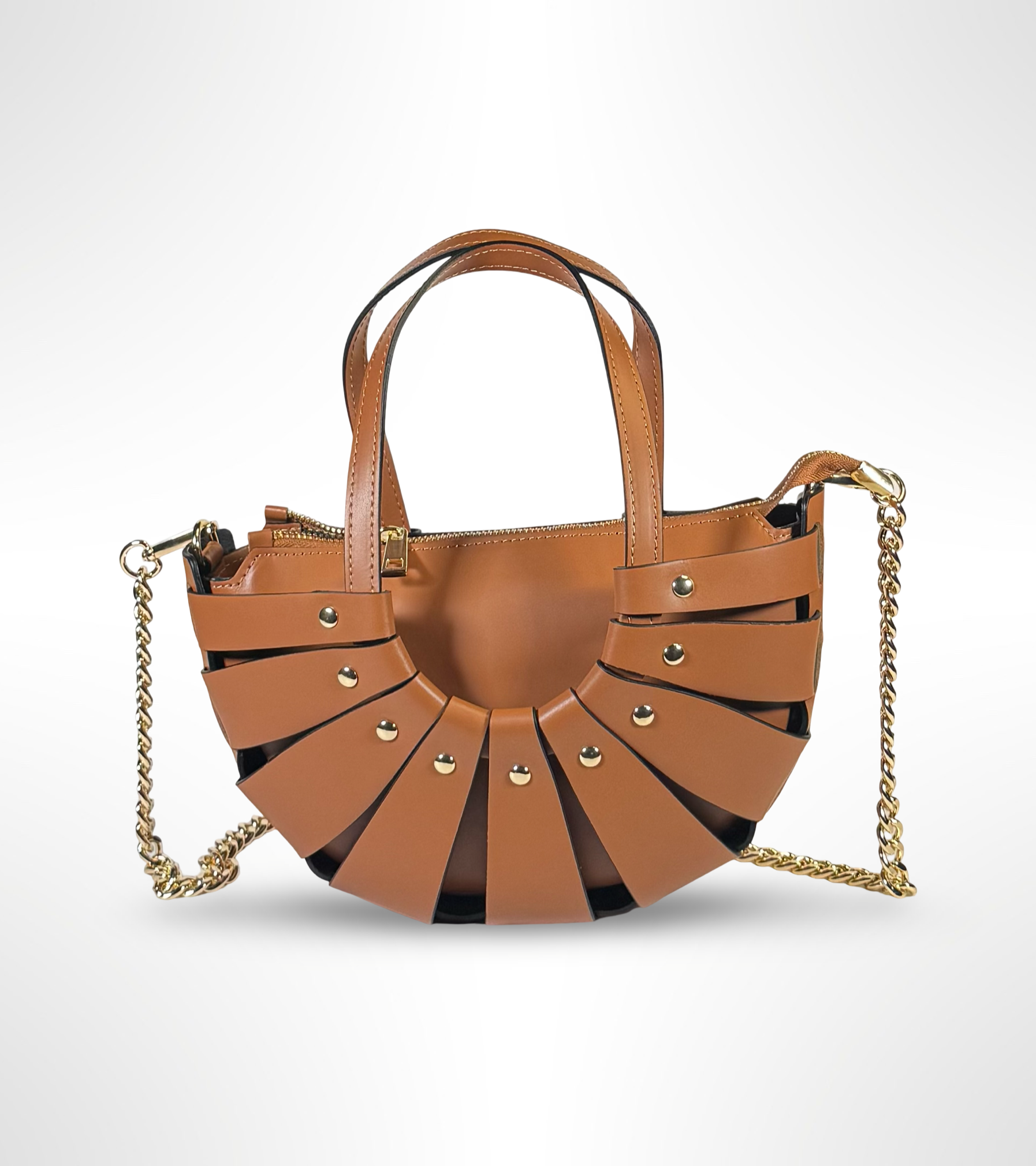 The Imola is a true statement piece — a modern, sculptural design crafted in smooth genuine leather. Its removable gold chain allows you to wear it as a chic handbag or a versatile crossbody. Medium-sized, bold, and refined, it transforms any outfit with its unique silhouette.