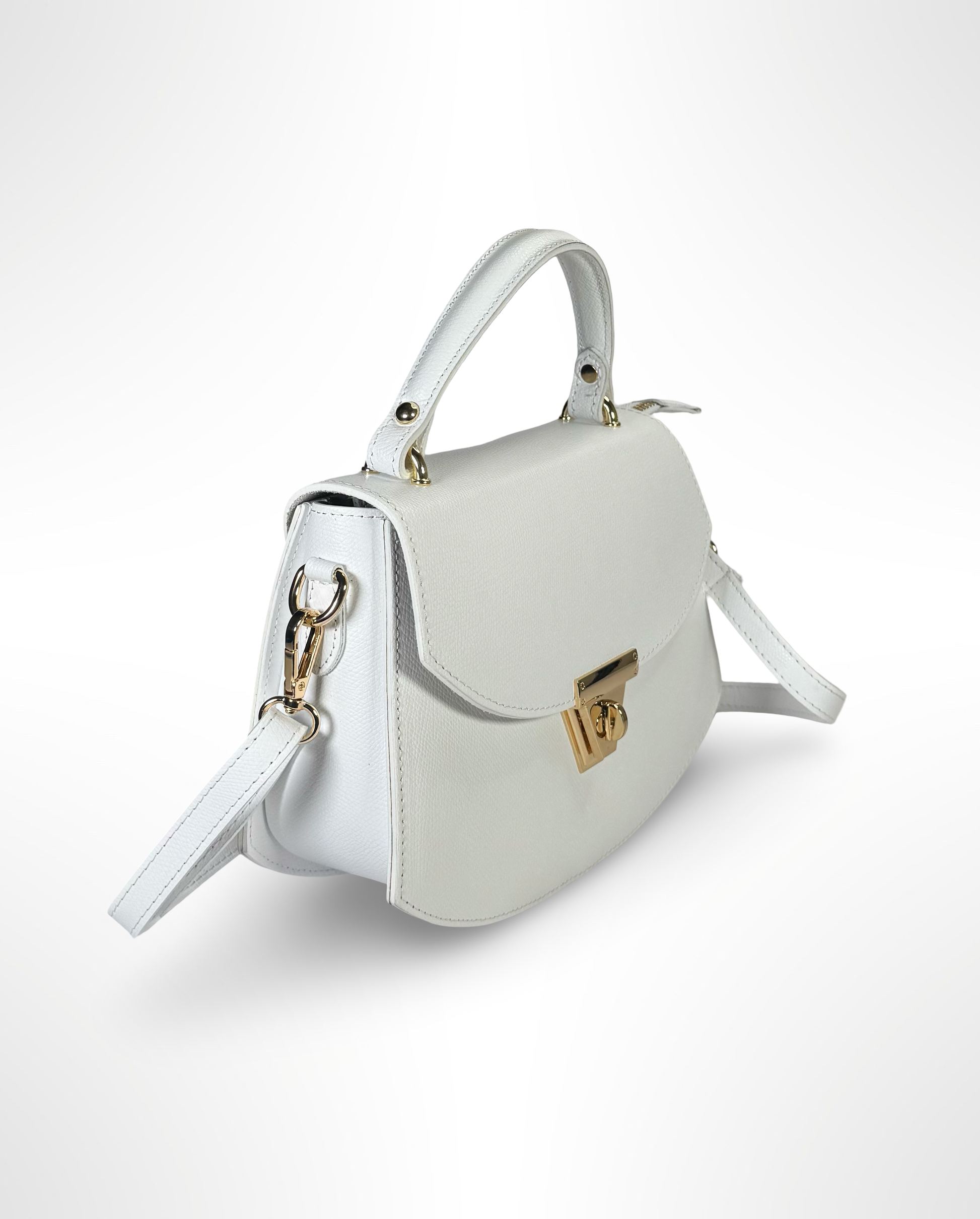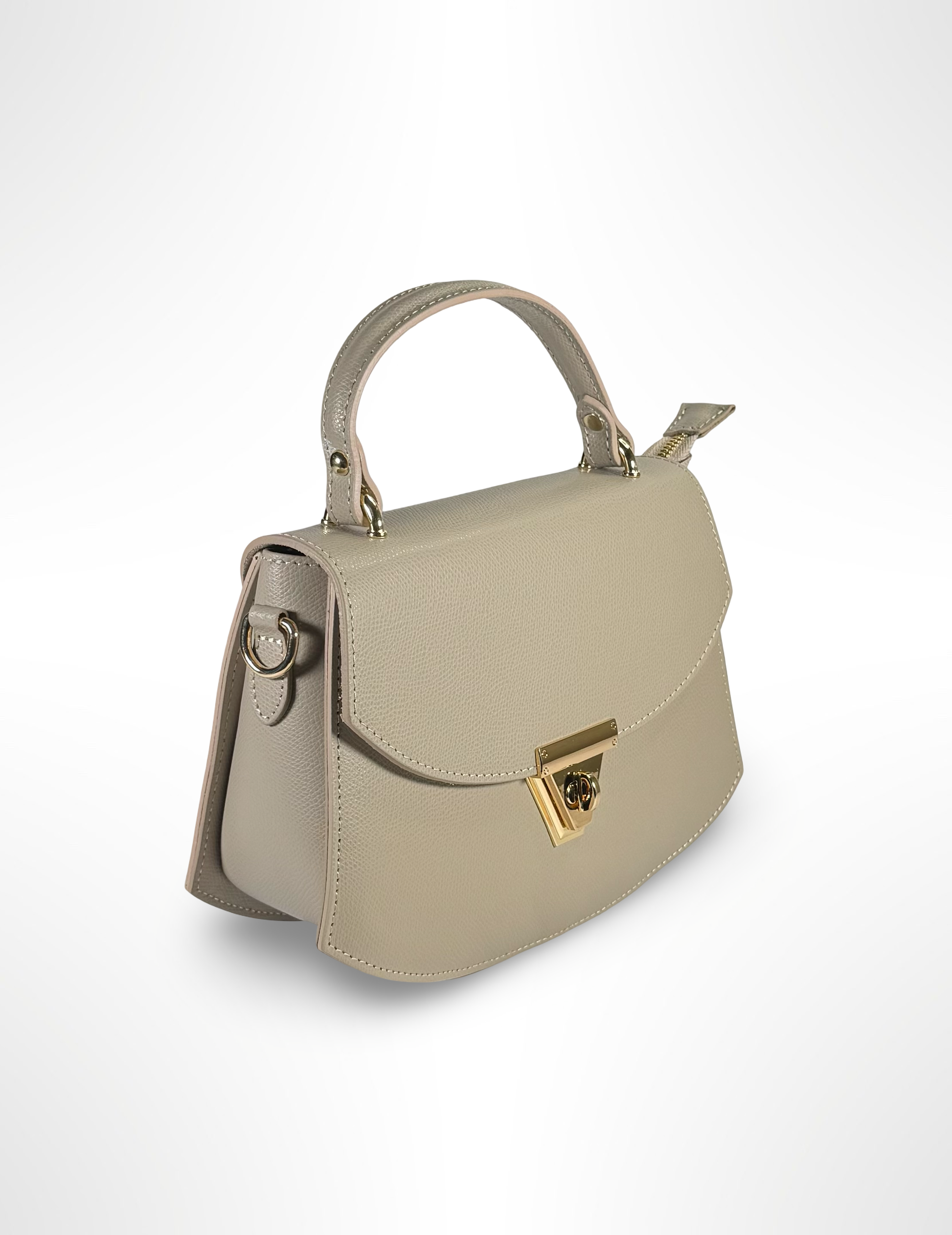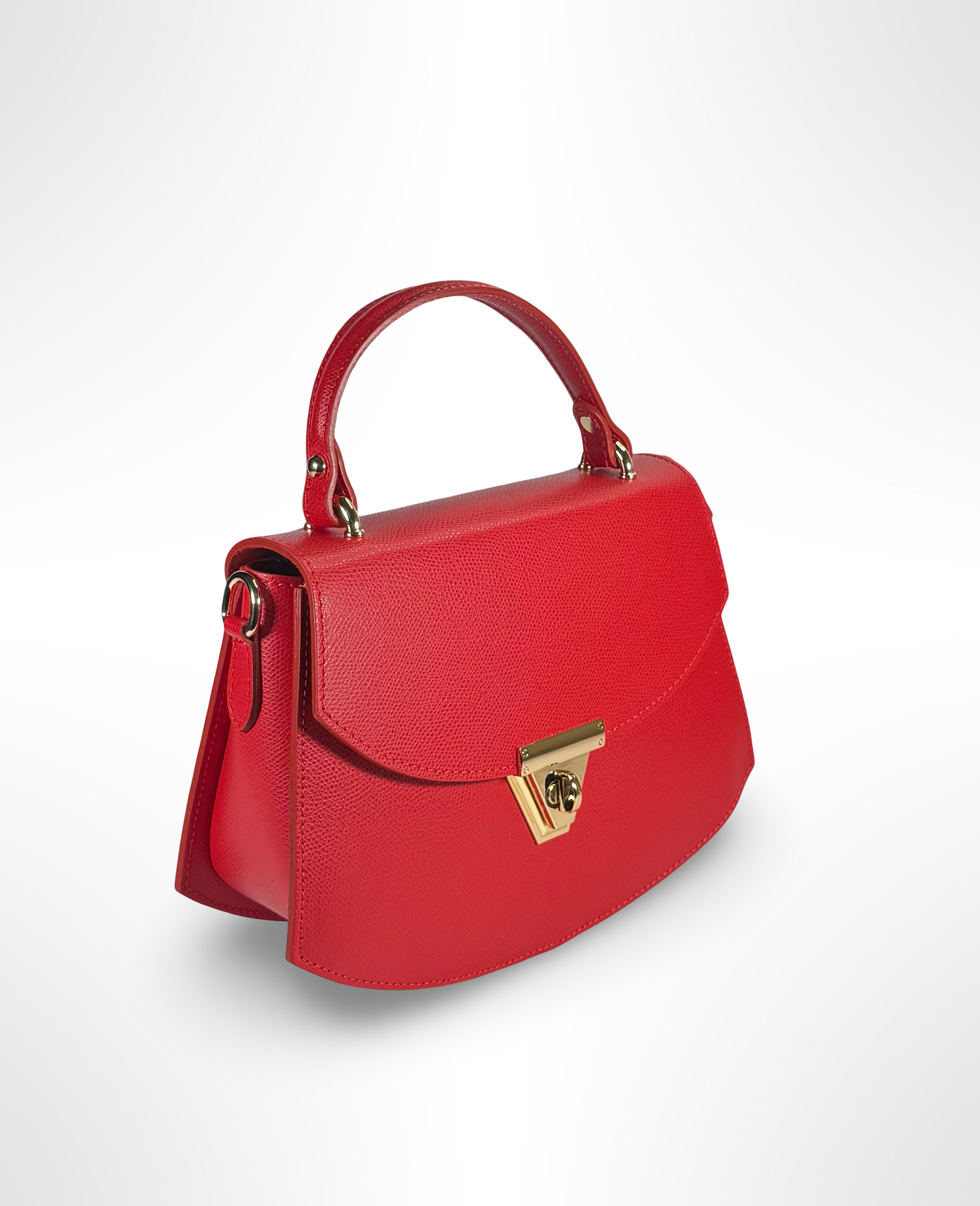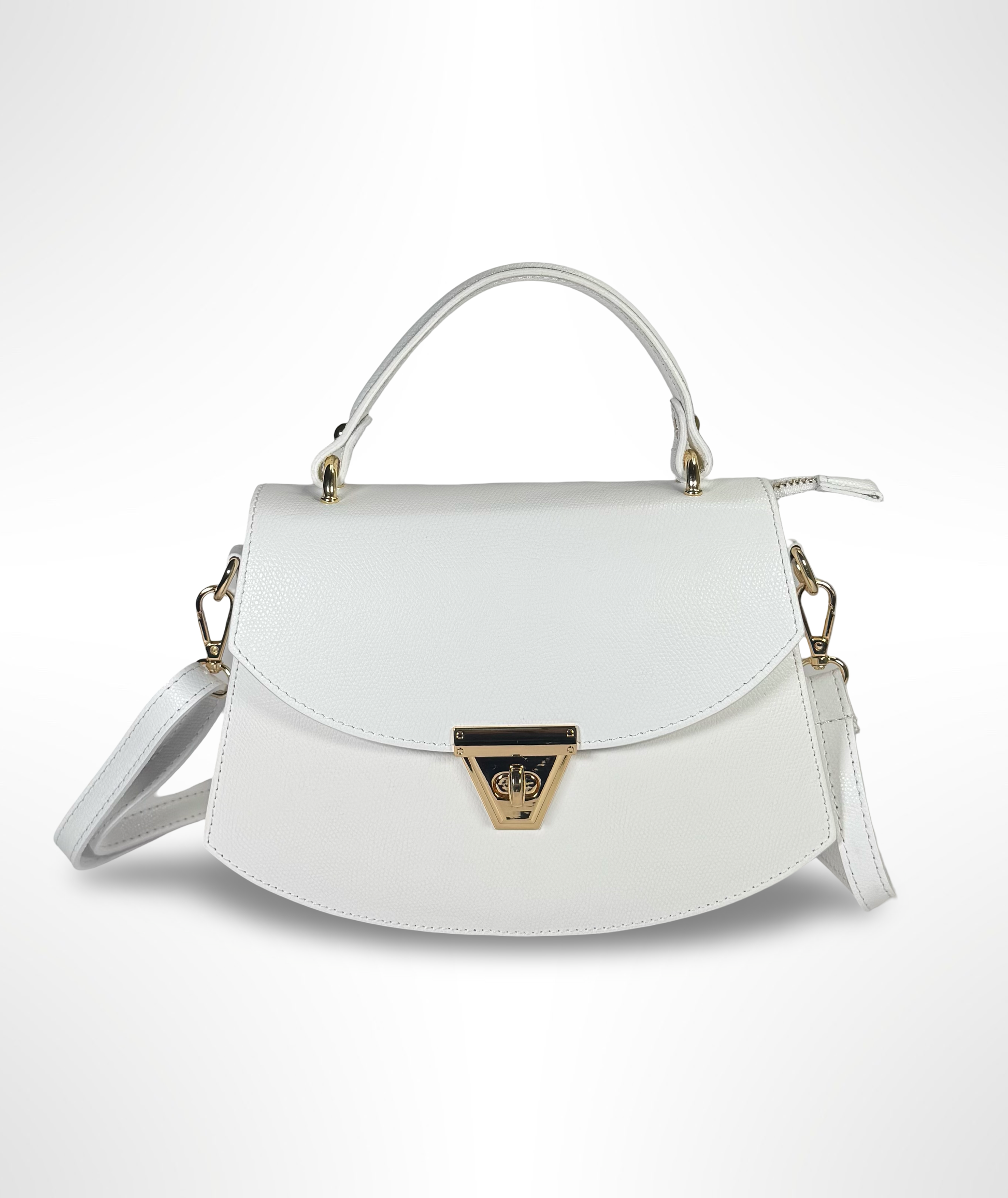 The Tivoli Handbag blends refined structure with a modern, feminine shape. Crafted in 100% genuine Italian leather, it features smooth edges, luxe gold hardware, and a distinctive triangular turn-lock closure.