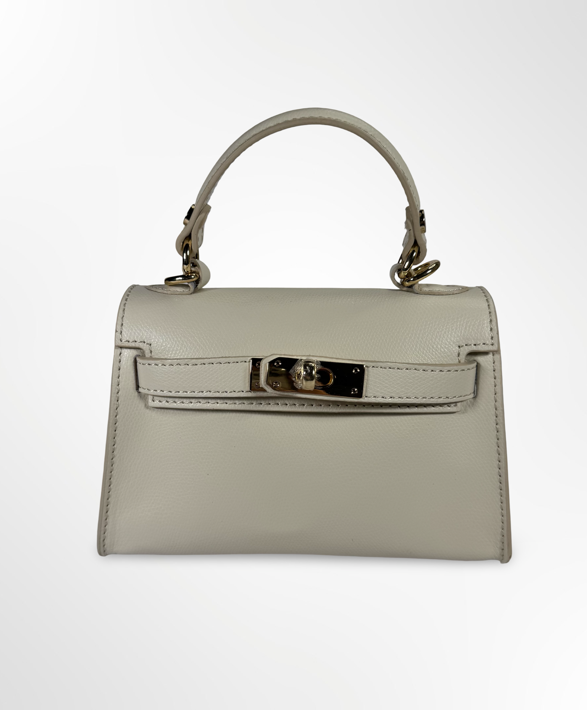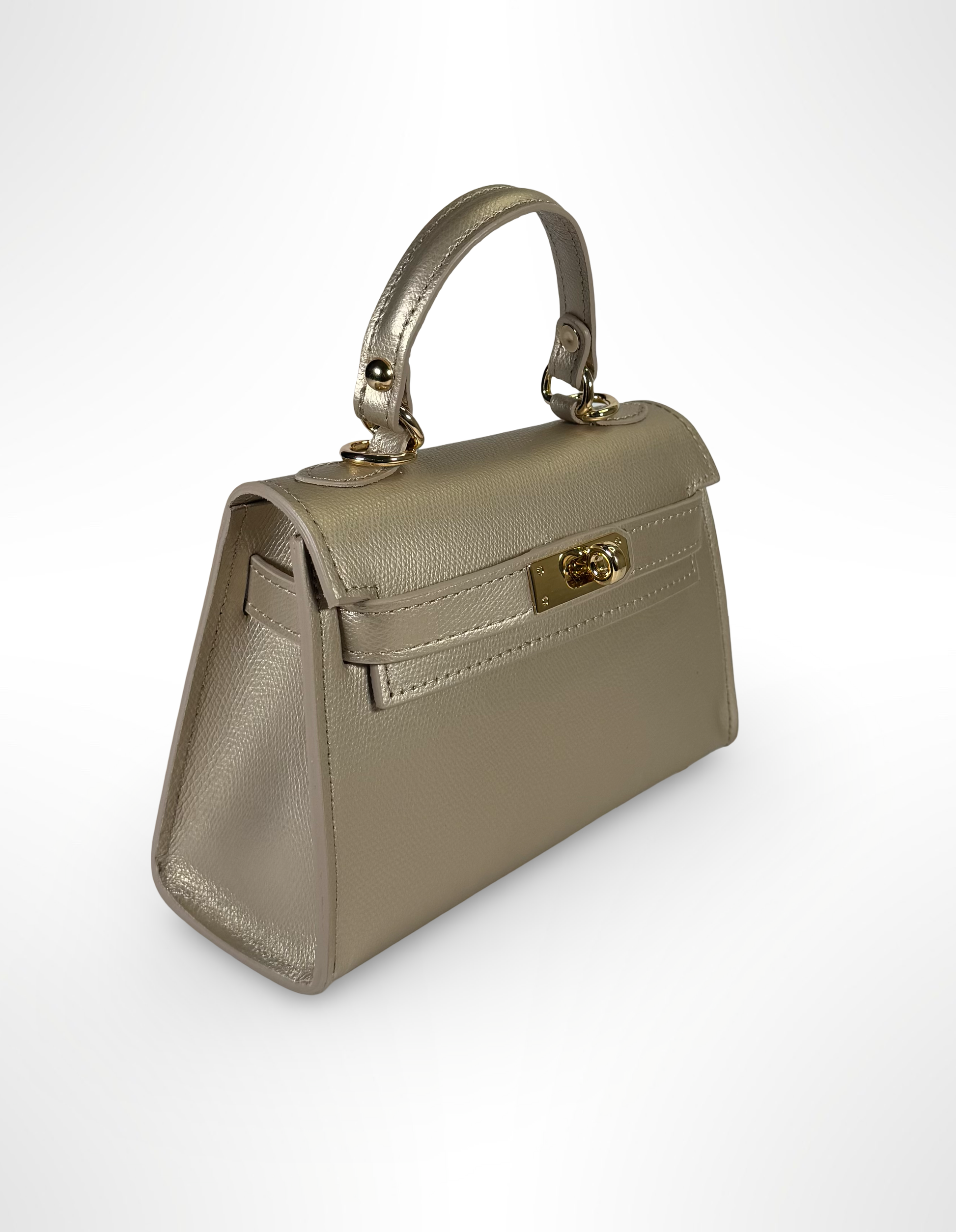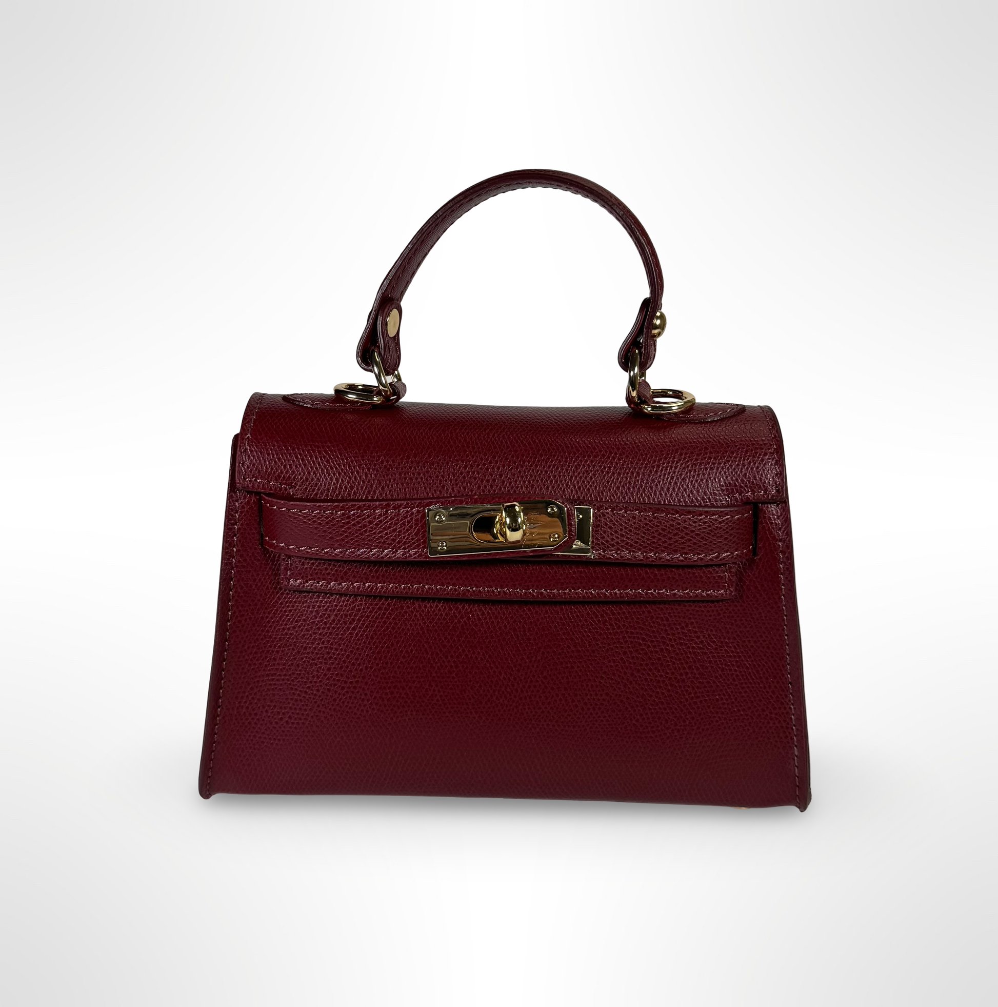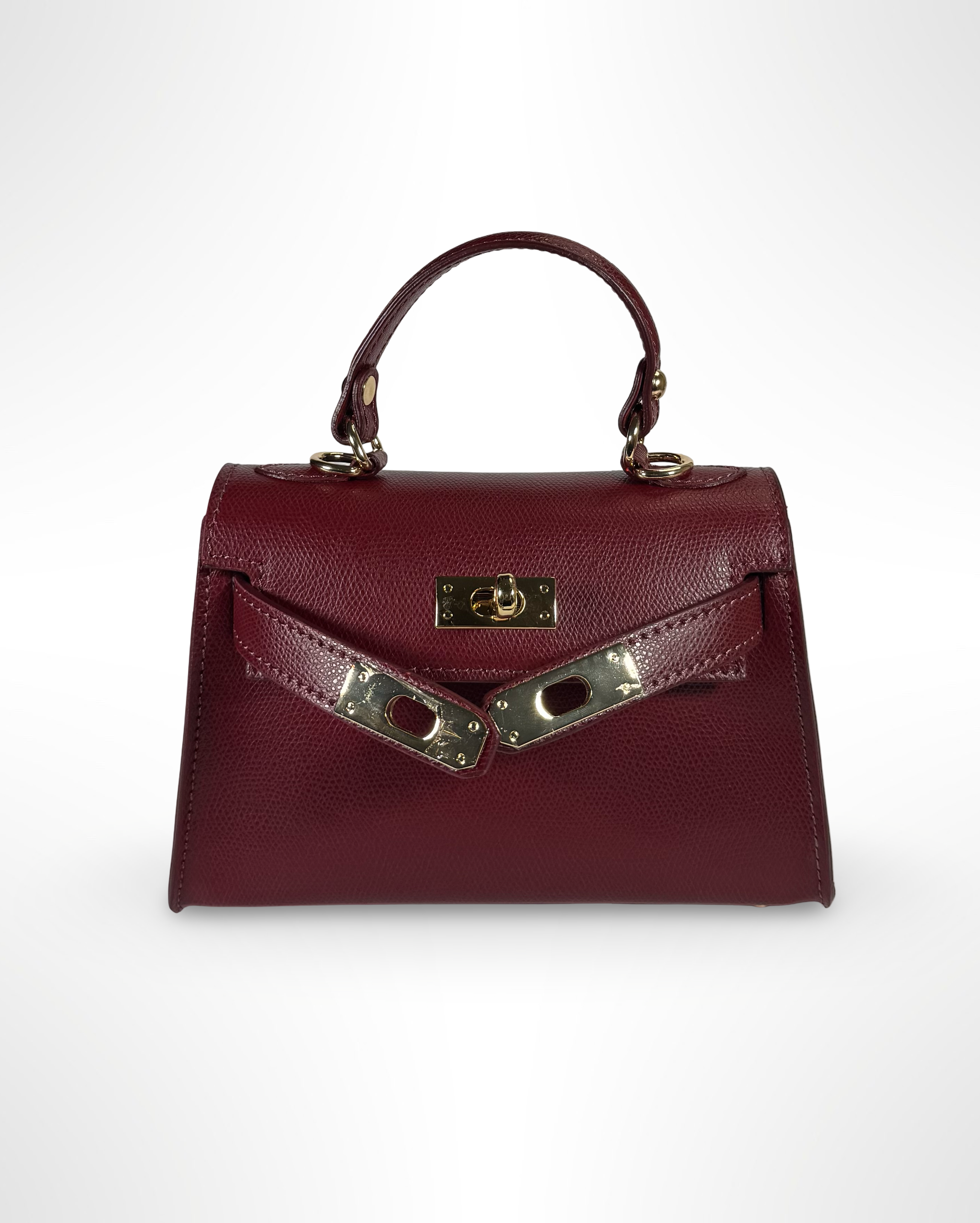 It features a top handle, a removable long strap for shoulder or crossbody wear, and a secure front turn-lock closure. Despite its mini size, it offers room for your essentials.