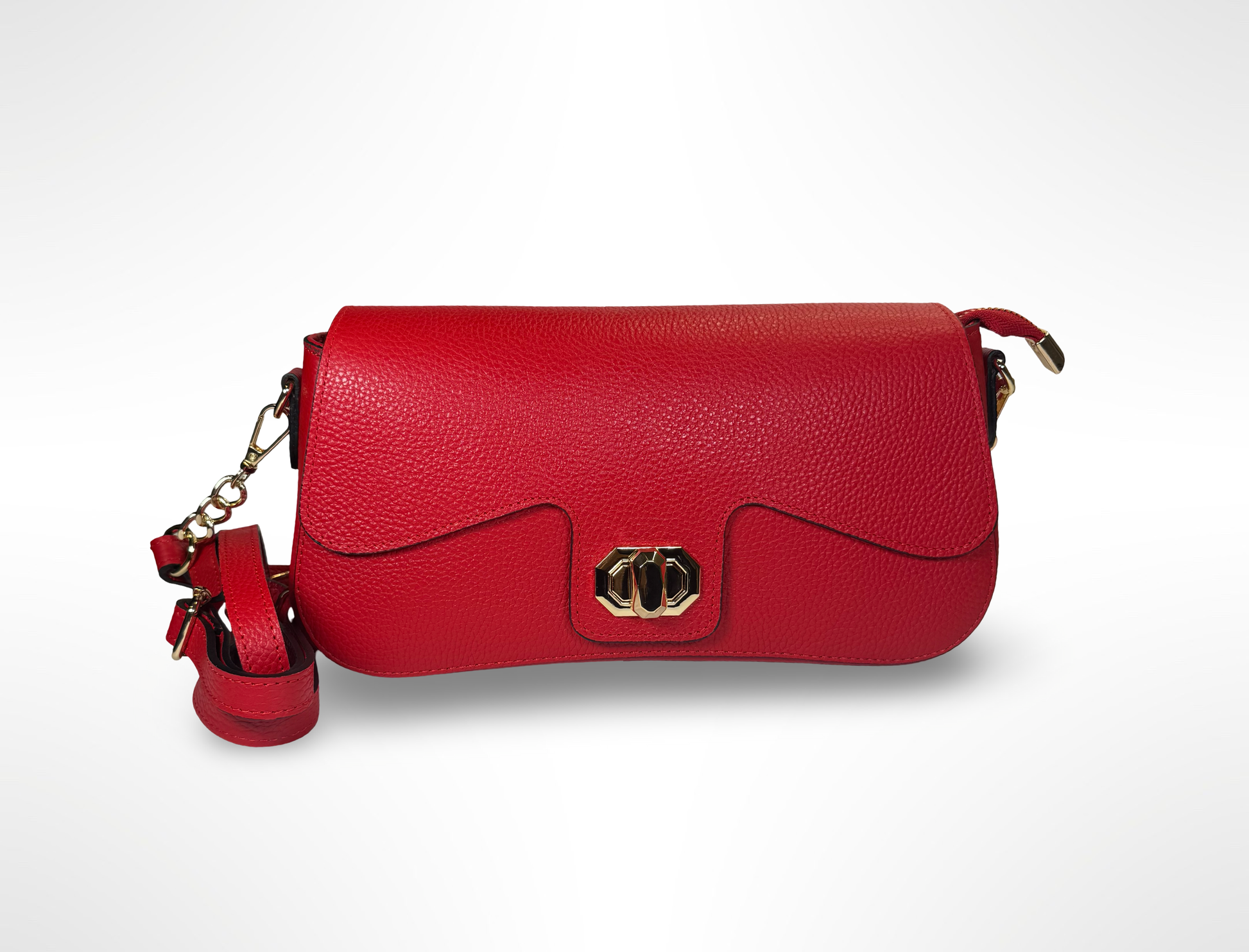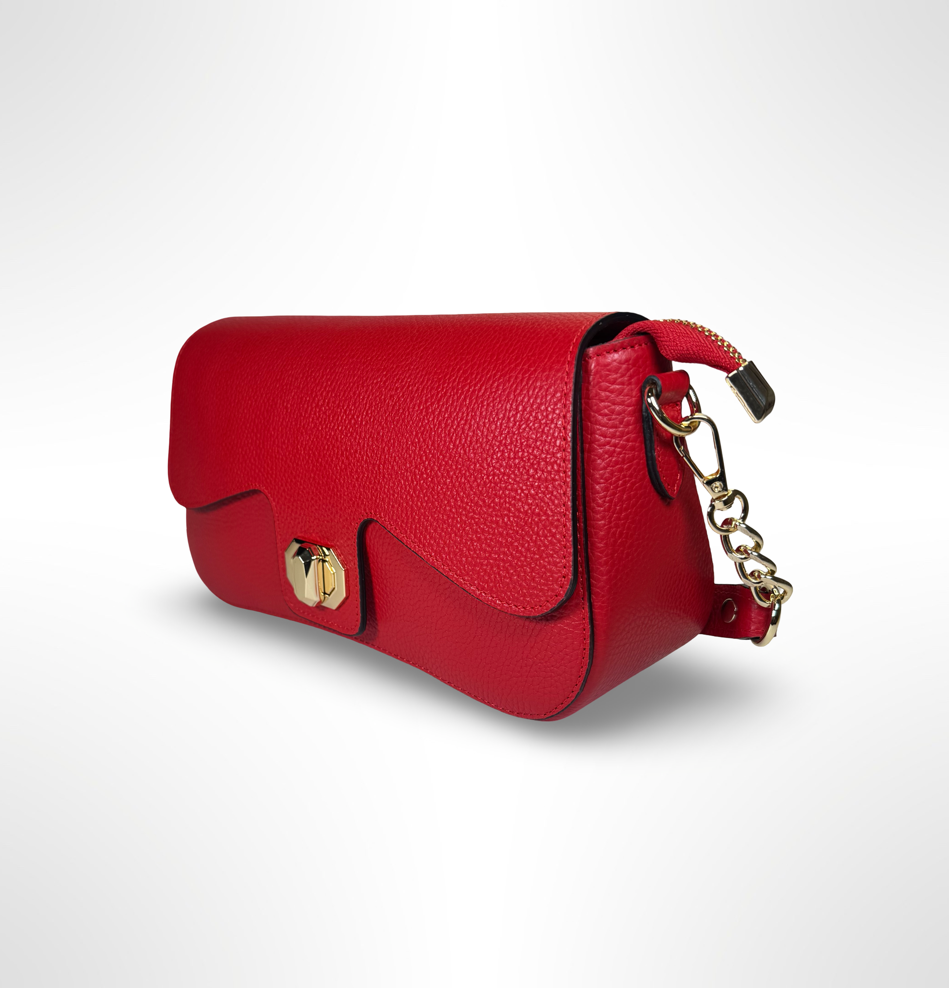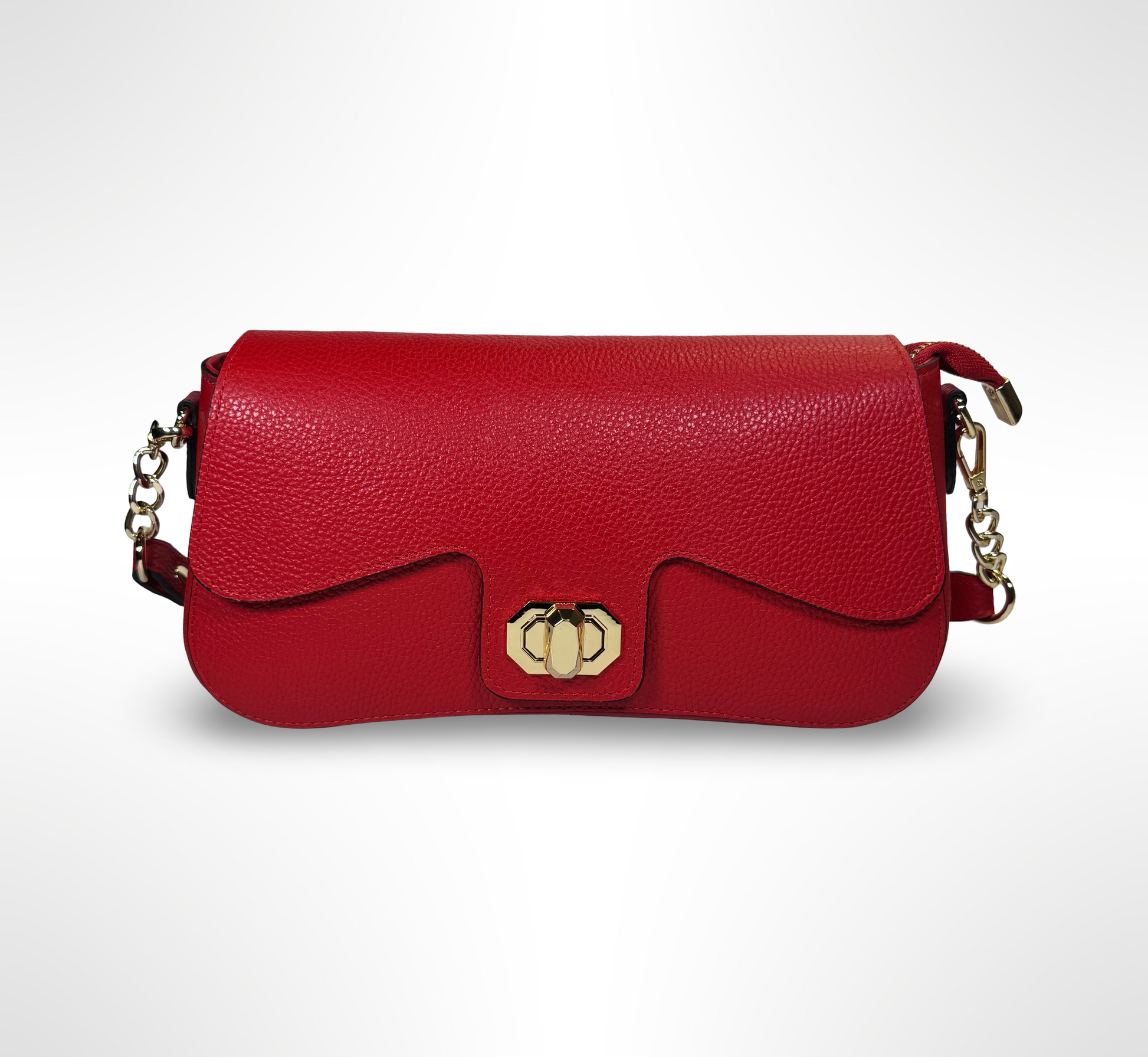 The Alma bag is a chic, medium-sized shoulder and crossbody bag crafted in premium Italian leather. Its wave-shaped flap, gold hardware, and bold red color make it the perfect statement piece for day or night. It includes two straps: a leather-and-chain shoulder strap and a full leather adjustable crossbody strap for versatile wear.